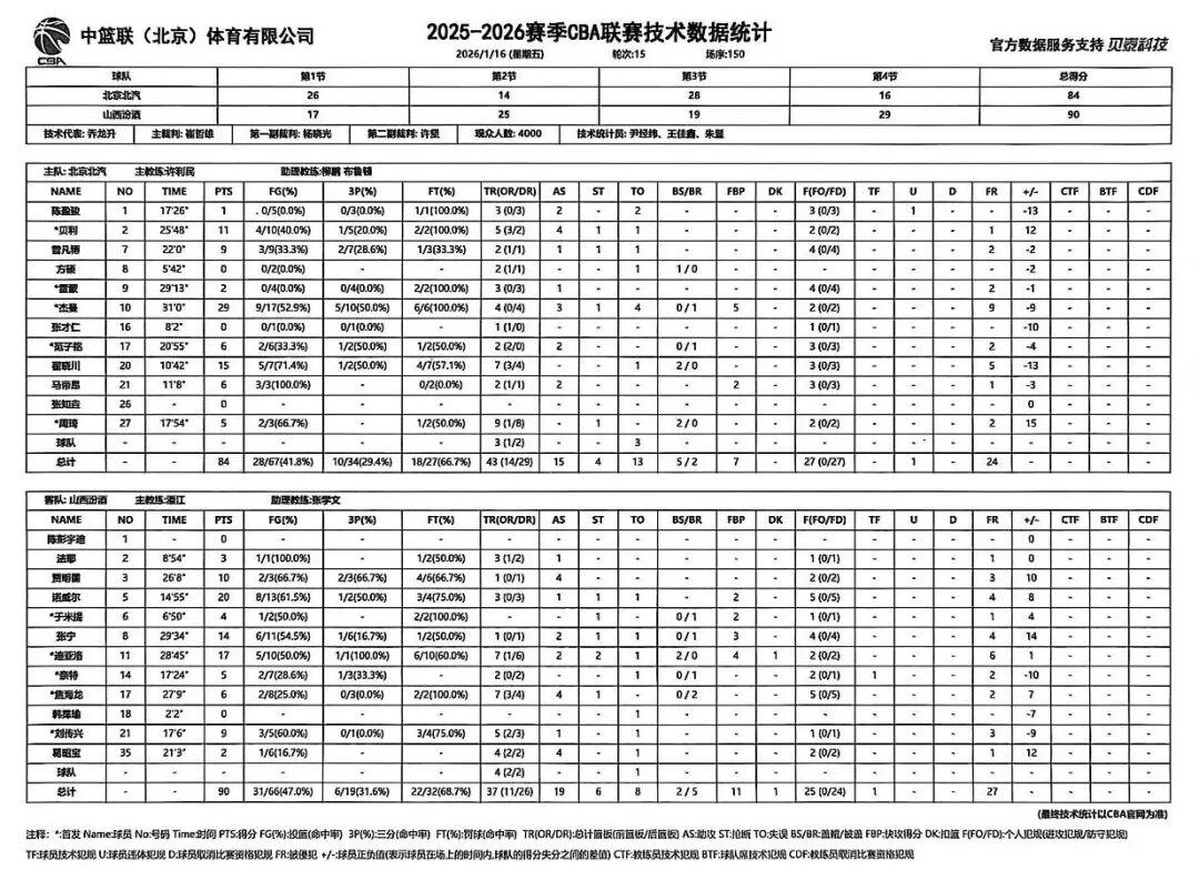 北京时间2026年1月16日19:35,2025-2026赛季CBA联赛常规赛第15轮继续进行,山西汾酒客场挑战北京北汽。两队历史上共交手52次,山西汾酒18胜34负;上赛季两队交手5次,山西汾酒2胜3负。本场比赛,山西队背负巨大压力,开局依旧慢热,进攻端畏首畏尾,一度陷入停滞。经教练组调整后,全队团结一致、力拼防守,始终紧咬比分,末节关键时刻展现出足够韧劲,最终成功取胜。全场比赛结束,山西汾酒90:84战胜北京北汽。
